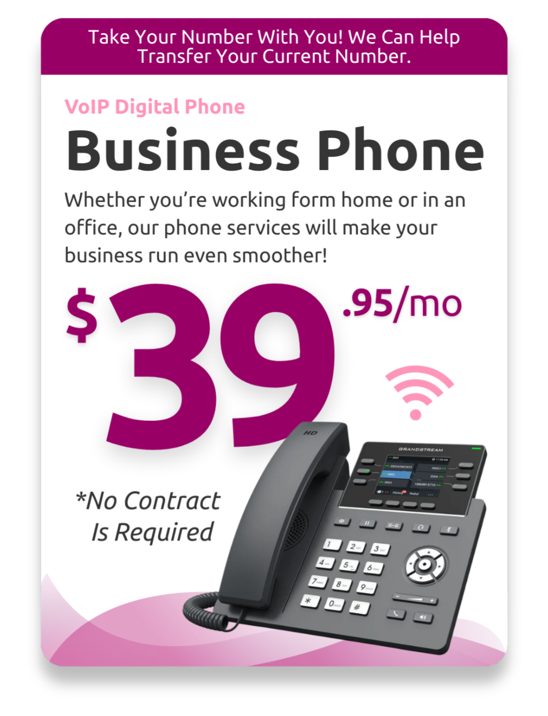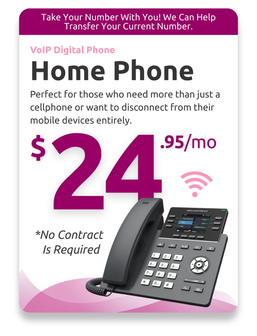 Our Digital Phone Service (VoIP) lets you enjoy everything a regular phone offers for a fraction of the price and depending on your current provider, we can potentially allow you to keep your current number!